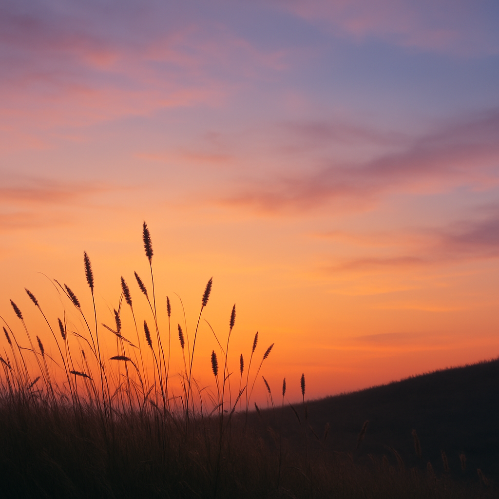 – 一日の終わりに、空がくれる贈り物。 🍂 夕暮れの光景丘の上から眺める夕暮れは、特別な時間だよね。昼間の強い光がやわらぎ、空は金色から橙色、やがて紫や群青に溶けていく。草の穂は風に揺れ、シルエットが丘の稜線を飾る。遠くから聞こえる鳥の声も...