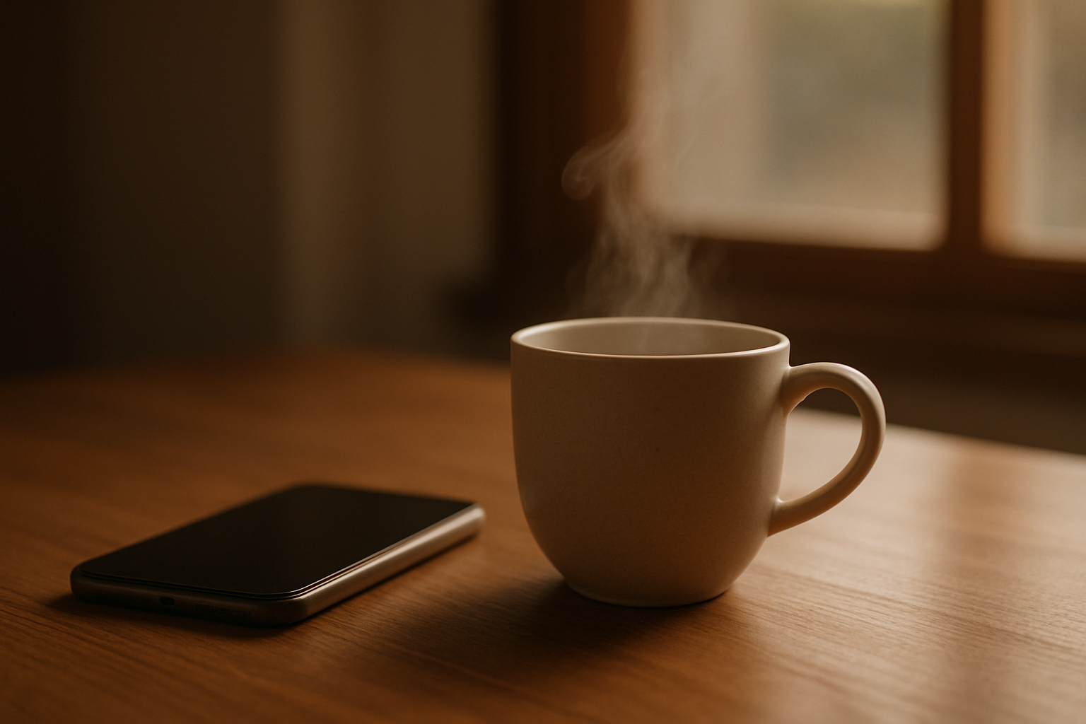 カップの湯気がゆらいで、窓の外では風が小さな葉を揺らしている。